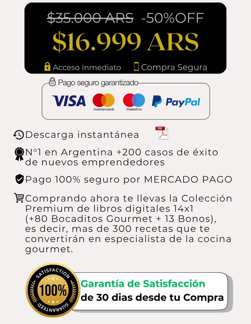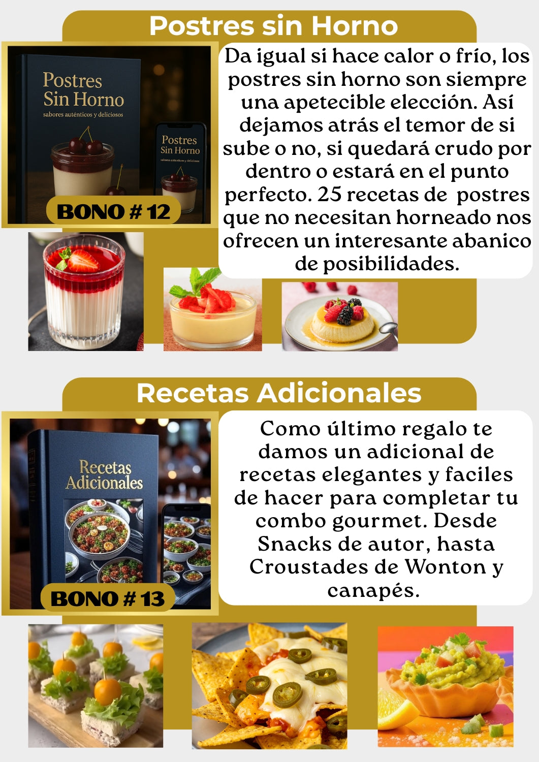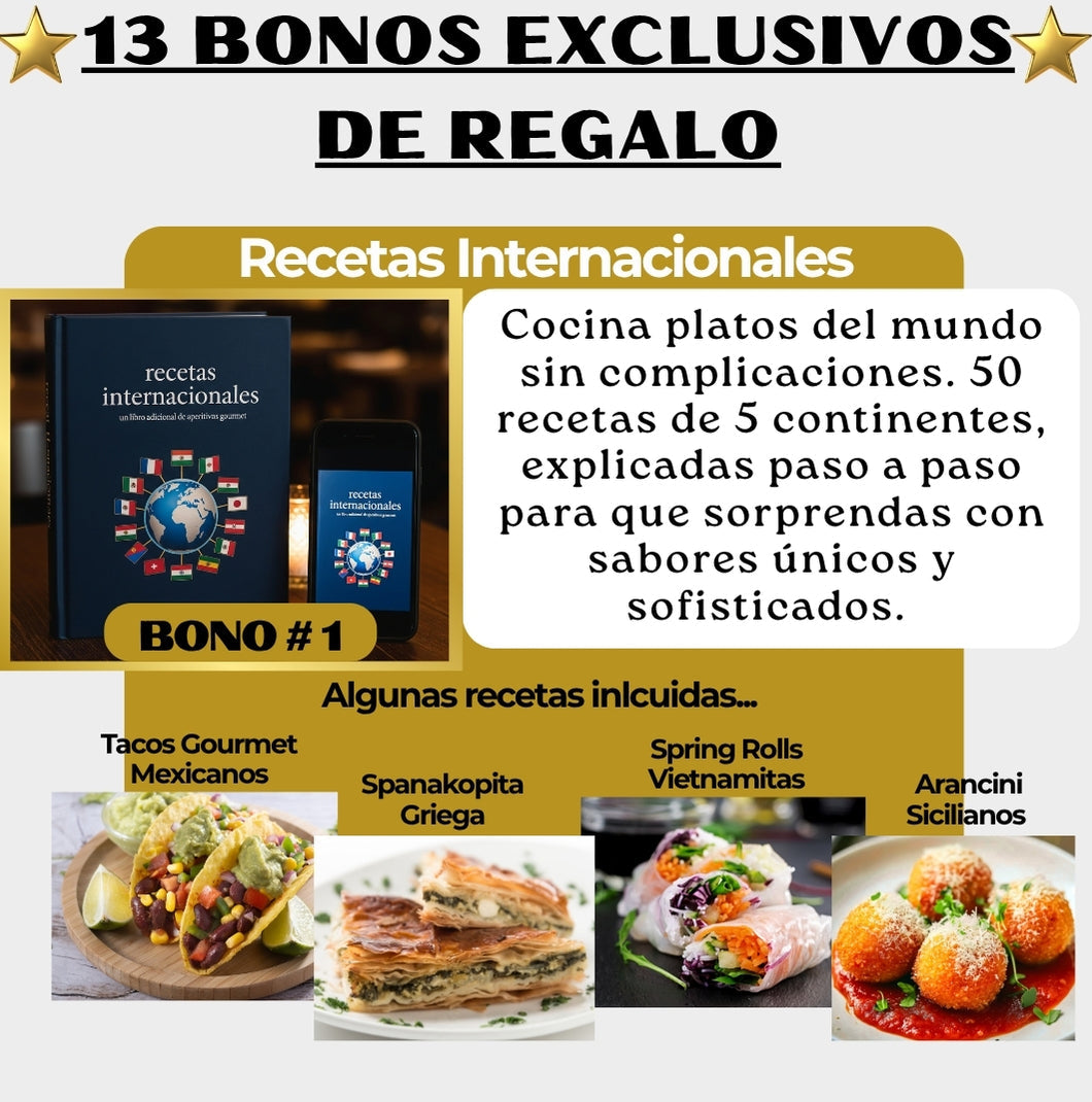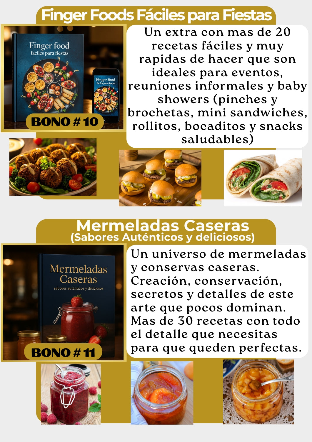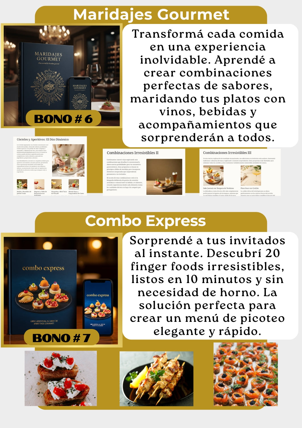 ¡Absolutamente no! Esto no es solo un libro de recetas. Es tu pasaporte para convertirte en el anfitrión que todos admiran. Con 13 bonos de regalo, te damos todo, desde bocados gourmet hasta salsas y postres, para que no solo prepares comida, sino que crees experiencias memorables.