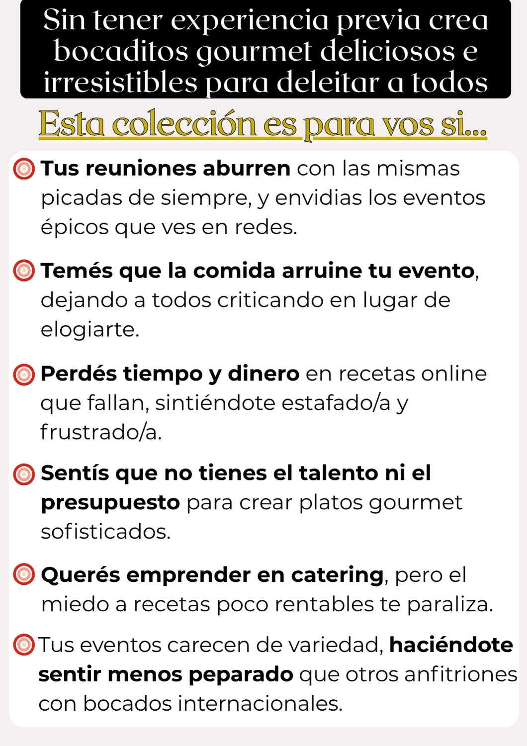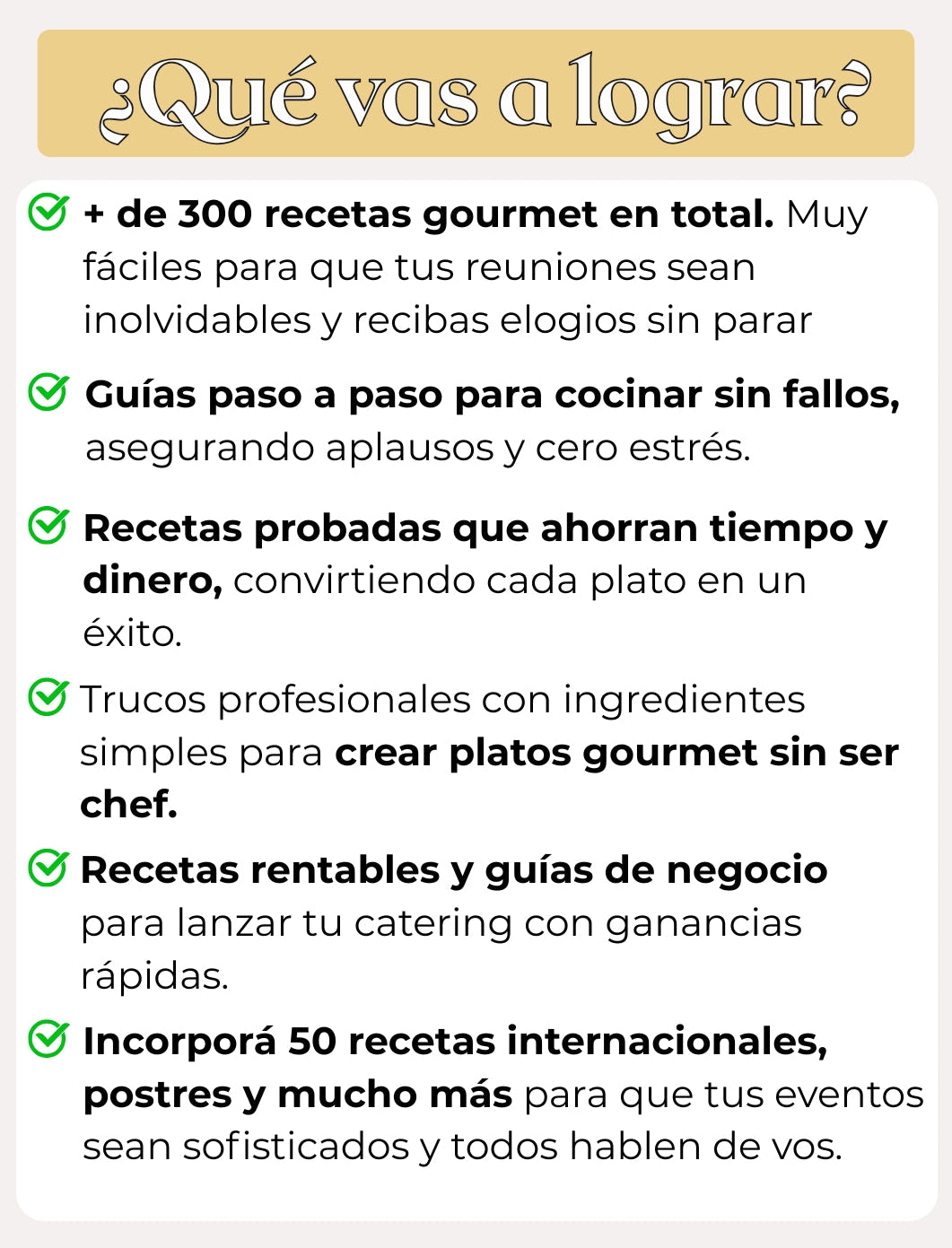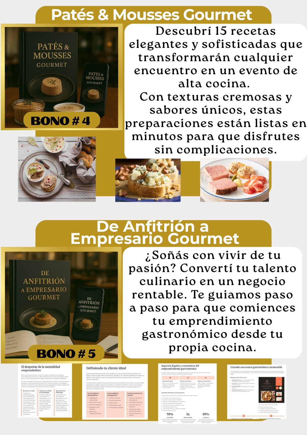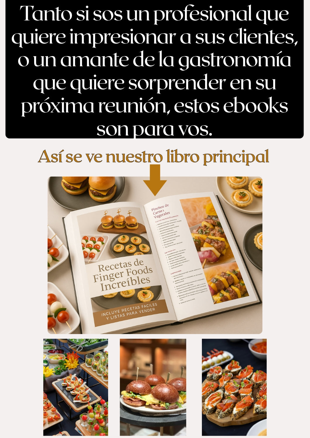 ¡Absolutamente no! Esto no es solo un libro de recetas. Es tu pasaporte para convertirte en el anfitrión que todos admiran. Con 13 bonos de regalo, te damos todo, desde bocados gourmet hasta salsas y postres, para que no solo prepares comida, sino que crees experiencias memorables.
