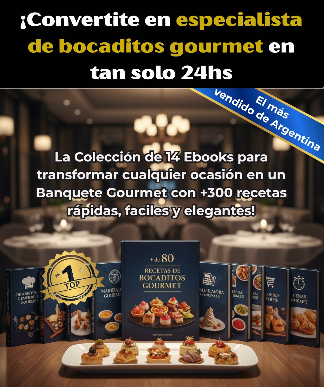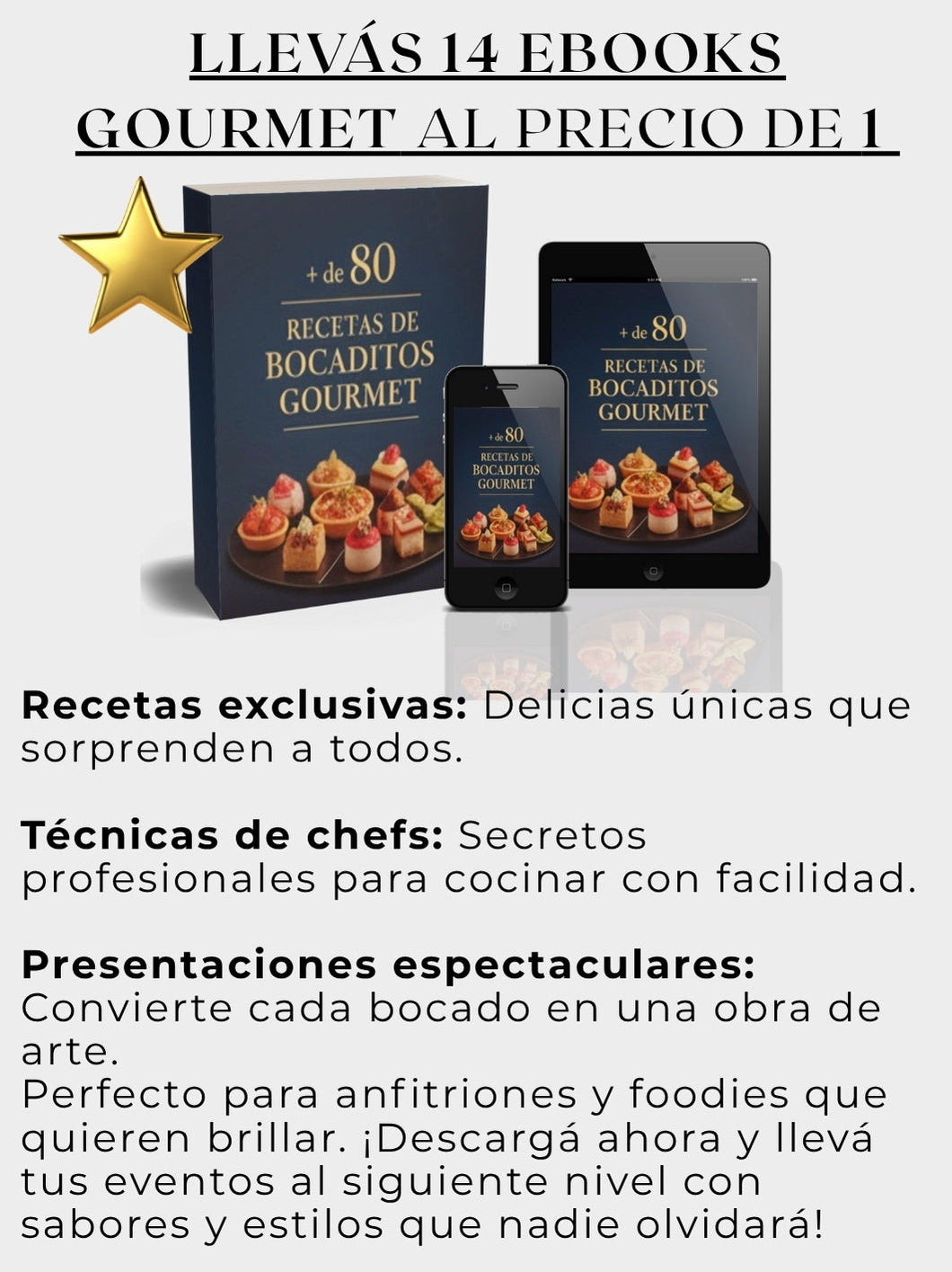 14 libros digitales al precio de 1. Conocé mas de 300 recetas gourmet para tus eventos o emprendimiento