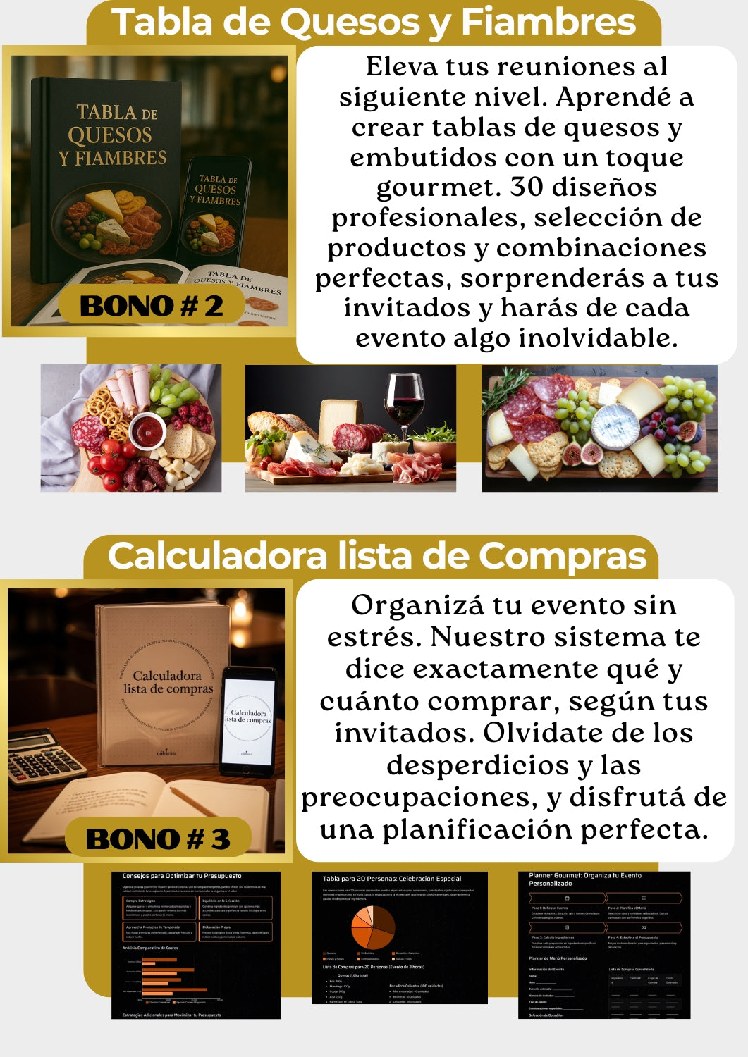 Internet te da fragmentos; nosotros te damos un sistema completo. Tienes todo lo que necesitas para montar un evento perfecto, desde los bocados hasta las bebidas. No tendrás que pasar horas buscando recetas en diferentes sitios. Todo está en un solo lugar, con 13 bonos de regalo que te ahorran tiempo y estrés.
