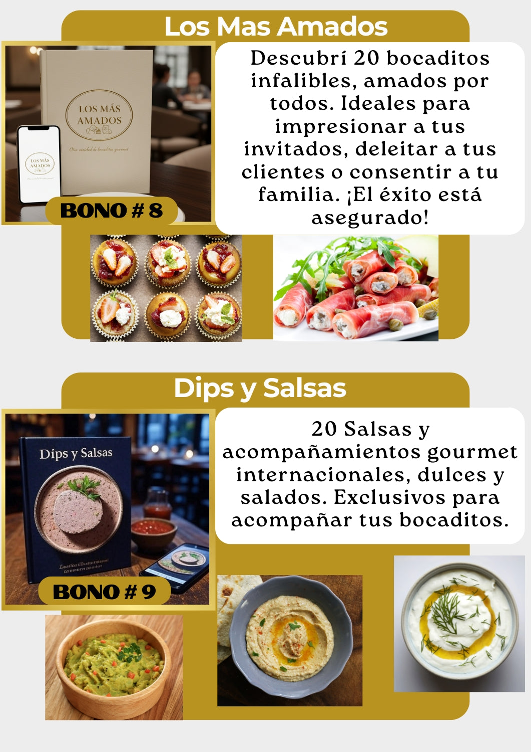 Los bonos no son un extra; son el alma de la fiesta. ¿Quieres hacer un evento completo y sorprender a todos? Necesitas más que solo recetas de bocados. Te damos el paquete completo para que no dejes nada al azar: salsas para acompañar, postres que enamoran y trucos para ser el anfitrión perfecto.