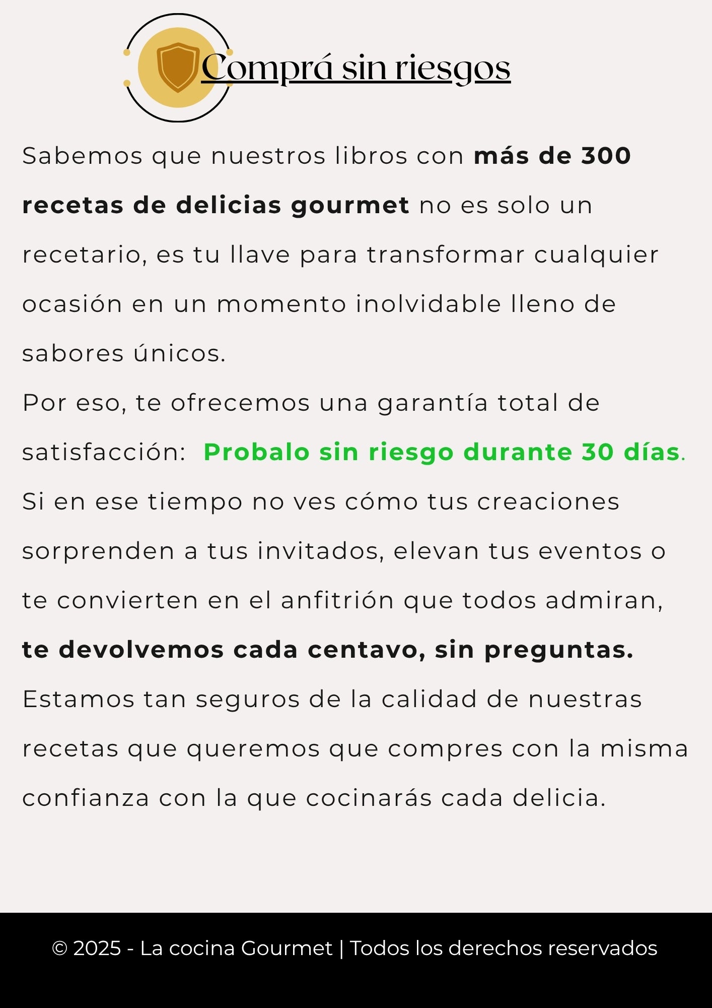 Estamos tan seguros de que nuestra colección de libros de cocina gourmet transformará tu experiencia en la cocina que te damos 30 días para probarlo.