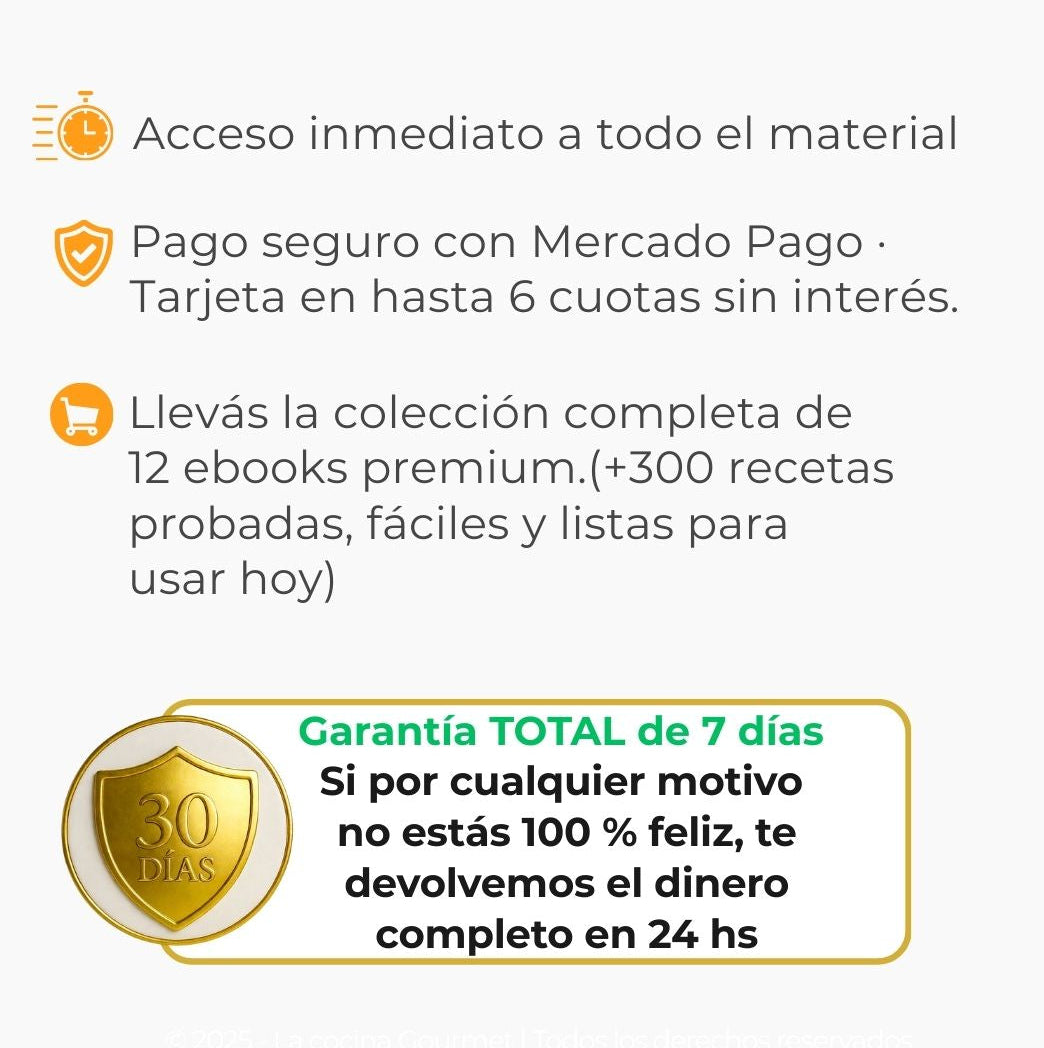 Tenés nuestra Garantía Total de 7 Días. Si sentís que las recetas no son para vos, nos mandás un mensaje y te devolvemos el 100% de tu dinero en 24 horas. Sin preguntas. El riesgo es todo nuestro.